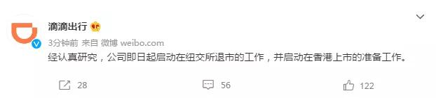 滴滴出行通過官方(fang)微博表(biao)示,經認真研(yan)究,公司即日起啟(qi)動在(zai)紐交所退市(shi)(shi)的(de)工作,并啟(qi)動在(zai)香港上市(shi)(shi)的(de)準備工作。而此時(shi)距(ju)離滴滴在(zai)紐交所上市(shi)(shi)僅僅過去4個月。