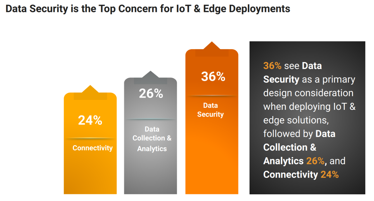 數(shu)據(ju)安全(quan)是物聯網和邊(bian)緣(yuan)部署的首要(yao)問(wen)題,36%的企業(ye)將數(shu)據(ju)安全(quan)視(shi)為(wei)部署物聯網和邊(bian)緣(yuan)解決方案時主(zhu)要(yao)的考慮(lv)因素。其(qi)次(ci)是數(shu)據(ju)收集和分析占(zhan)比26%,以及(ji)連接性(xing),占(zhan)比24%。