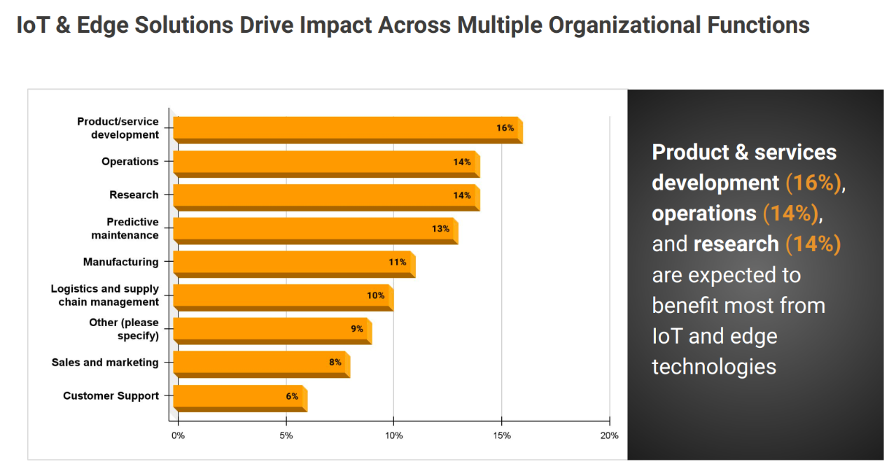 物聯網和邊(bian)緣(yuan)計算對企業(ye)各(ge)個部門的(de)影響是深遠的(de),產品和服務(wu)開發(16%)、運營(14%)和研發(14%)預計將從其(qi)中受益最大。