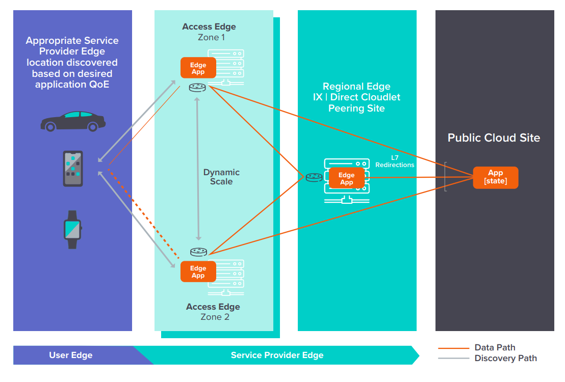 服(fu)務(wu)提(ti)(ti)供(gong)商(shang)邊緣的(de)實(shi)施需要綜(zong)合(he)考慮延(yan)遲、帶寬、隱私等用戶需求,涉及到不(bu)同的(de)部署類型(xing)。上圖(tu)提(ti)(ti)供(gong)了一種服(fu)務(wu)提(ti)(ti)供(gong)商(shang)邊緣的(de)部署實(shi)例(li),在這個例(li)子中(zhong),應用方(fang)案不(bu)僅跨越了多個服(fu)務(wu)提(ti)(ti)供(gong)商(shang)網絡,還與公(gong)有云合(he)作提(ti)(ti)供(gong)整合(he)服(fu)務(wu)。