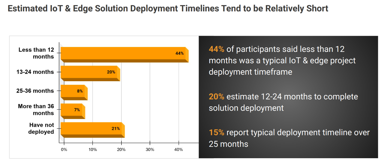 44%的(de)受(shou)訪者表示,典型(xing)的(de)物聯(lian)網和邊緣項目部(bu)(bu)署(shu)時間不到12個(ge)月(yue)。20%的(de)受(shou)訪者經(jing)歷(li)了12-24個(ge)月(yue)才能完成解決方案(an)部(bu)(bu)署(shu)。還有(you)(you)15%的(de)受(shou)訪者報告(gao)他們的(de)部(bu)(bu)署(shu)時間超過25個(ge)月(yue),更有(you)(you)7%甚至(zhi)超過36個(ge)月(yue)。