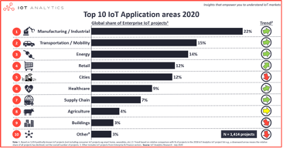 知名物聯網研究機構(gou)IoT Analytics 2020年的(de)最新報(bao)告顯示,與(yu)往年相比,當前(qian)大多數物聯網項目仍然落(luo)地于(yu)工(gong)業(ye)/制造業(ye)領域,另外,交通、能源、零售及醫(yi)療保健等垂(chui)直(zhi)領域的(de)市(shi)場份額也相對增加。