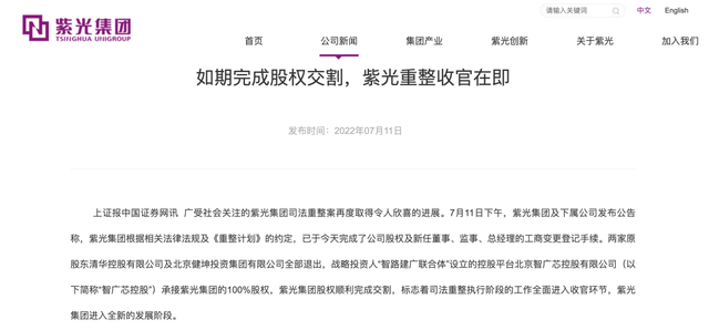 紫(zi)光(guang)集團(tuan)發(fa)布公告,宣布紫(zi)光(guang)集團(tuan)實質(zhi)合(he)并重整交割(ge)順利完(wan)成。