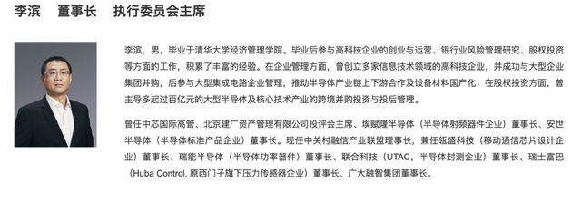 據介紹,李(li)濱(bin)同樣也(ye)是“清華系”,畢(bi)業(ye)(ye)于清華大學(xue)經濟管(guan)理(li)學(xue)院(yuan),曾創立多家信息(xi)技(ji)術領域的(de)高科技(ji)企(qi)(qi)業(ye)(ye),并(bing)成功與(yu)大型企(qi)(qi)業(ye)(ye)集團并(bing)購(gou)。值(zhi)得一提(ti)的(de)是,李(li)濱(bin)還曾任中芯國(guo)際高管(guan)、安(an)世(shi)半(ban)導體(半(ban)導體標準產品企(qi)(qi)業(ye)(ye))董事長(chang),并(bing)主導多起過百億元的(de)大型半(ban)導體及核心(xin)技(ji)術產業(ye)(ye)的(de)跨境(jing)并(bing)購(gou)投(tou)資(zi)與(yu)投(tou)后管(guan)理(li)。