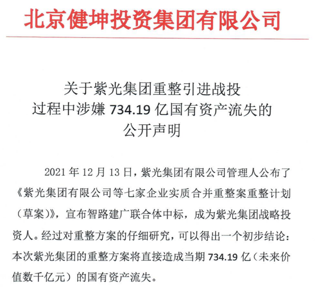 而(er)就在2天后,12月15日(ri)晚間,紫光(guang)集團的(de)第(di)二大股(gu)東、由趙偉國(guo)實際控(kong)制的(de)北(bei)京(jing)健坤投資集團有限公司(以下簡稱健坤集團)通過社交媒體發布了《關于紫光(guang)集團重整(zheng)引進戰投過程中涉嫌734.19億國(guo)有資產流失的(de)公開聲明(ming)》。