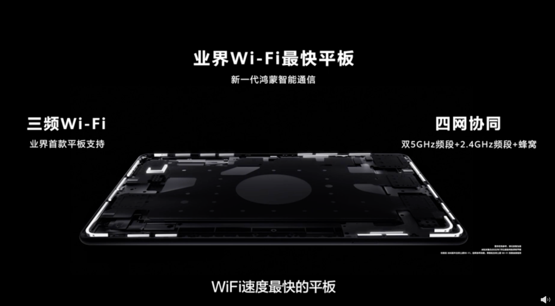 在通信網絡方面,華(hua)為(wei)MatePad Pro基于HarmonyOS智慧通(tong)信技(ji)術,支持三(san)頻(pin)Wi-Fi與(yu)四(si)網協(xie)同,理論(lun)峰值速率高達5.2Gbps,成(cheng)為(wei)目前業界Wi-Fi速度最(zui)快的(de)平板。
