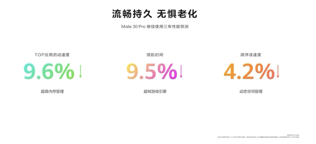 在流暢性方面,何剛直接甩出了一組數據——3年前的老旗艦機Mate 30 Pro升級鴻蒙OS 3.0后的性能實測顯示,TOP應用啟動速度優化9.6%;續航時間優化9.5%,而順序讀取速度也有4.2%的提升。