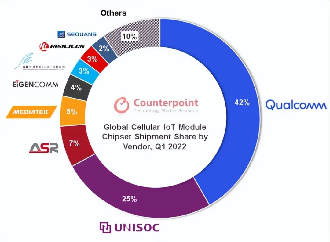 除了海思之(zhi)外(因眾所周知的(de)(de)原因被(bei)打(da)壓),紫(zi)光展(zhan)(zhan)銳目前逐(zhu)漸(jian)成(cheng)長為國產蜂(feng)窩(wo)芯片市(shi)(shi)場(chang)的(de)(de)第一梯隊企業,該(gai)公(gong)司的(de)(de)5G芯片已進入手機市(shi)(shi)場(chang)。根據Counterpoint的(de)(de)數據,2022年一季度(du)全(quan)球蜂(feng)窩(wo)物聯網模塊芯片市(shi)(shi)場(chang)上(shang)(shang),紫(zi)光展(zhan)(zhan)銳以(yi)25%份額排名第2,翱捷科技以(yi)7%份額位居(ju)第3。移(yi)芯、芯翼、海思等國產企業也都有上(shang)(shang)榜。