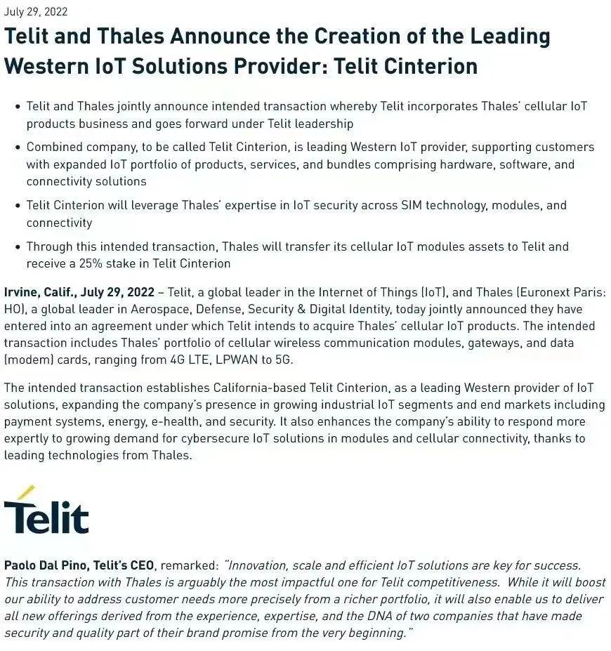 近日,海外知名物聯網模組廠商Telit宣布將收購法國防務、航空、軌道交通和安全供應商Thales旗下的蜂窩物聯網模組業務,并組建新的公司Telit Cinterion。