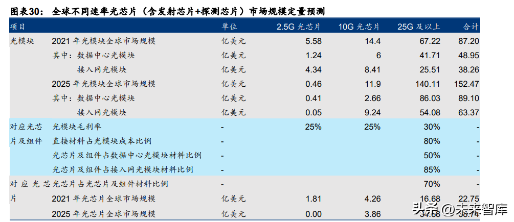 1) 行業出(chu)貨結構向 25G 及以(yi)上(shang)(shang)速(su)(su)(su)率(lv)芯(xin)片(pian)進一步(bu)傾(qing)斜。在數通以(yi)及電信(xin)市(shi)場需求(qiu)的(de)(de)拉(la)動下(xia), 我們測算全球(qiu)高(gao)(gao)速(su)(su)(su)率(lv)激光(guang)芯(xin)片(pian)市(shi)場規模將由(you) 2021 年(nian)(nian)的(de)(de) 11 億(yi)美元(yuan)提(ti)升至(zhi) 2025 年(nian)(nian)的(de)(de) 19 億(yi)美元(yuan),對(dui)應期(qi)(qi)間 CAGR 為 14%;其中 25G 及以(yi)上(shang)(shang)速(su)(su)(su)率(lv)芯(xin)片(pian)市(shi)場規模預(yu)計由(you) 2021 年(nian)(nian) 的(de)(de) 8 億(yi)美元(yuan)提(ti)升至(zhi) 2025 年(nian)(nian)的(de)(de) 17 億(yi)美元(yuan),對(dui)應期(qi)(qi)間 CAGR 為 20%,出(chu)貨金額的(de)(de)占比有(you) 望由(you) 2021 年(nian)(nian)的(de)(de) 73%提(ti)升至(zhi) 2025 年(nian)(nian)的(de)(de) 90%,有(you)望實現超越行業的(de)(de)增長,我們認(ren)為驅動 因素主要系全球(qiu)移(yi)動通信(xin)、數據中心等領域通信(xin)系統向更(geng)快傳輸速(su)(su)(su)率(lv)升級背景下(xia),更(geng)高(gao)(gao) 速(su)(su)(su)率(lv)的(de)(de)激光(guang)芯(xin)片(pian)需求(qiu)有(you)望快速(su)(su)(su)釋放(fang)。