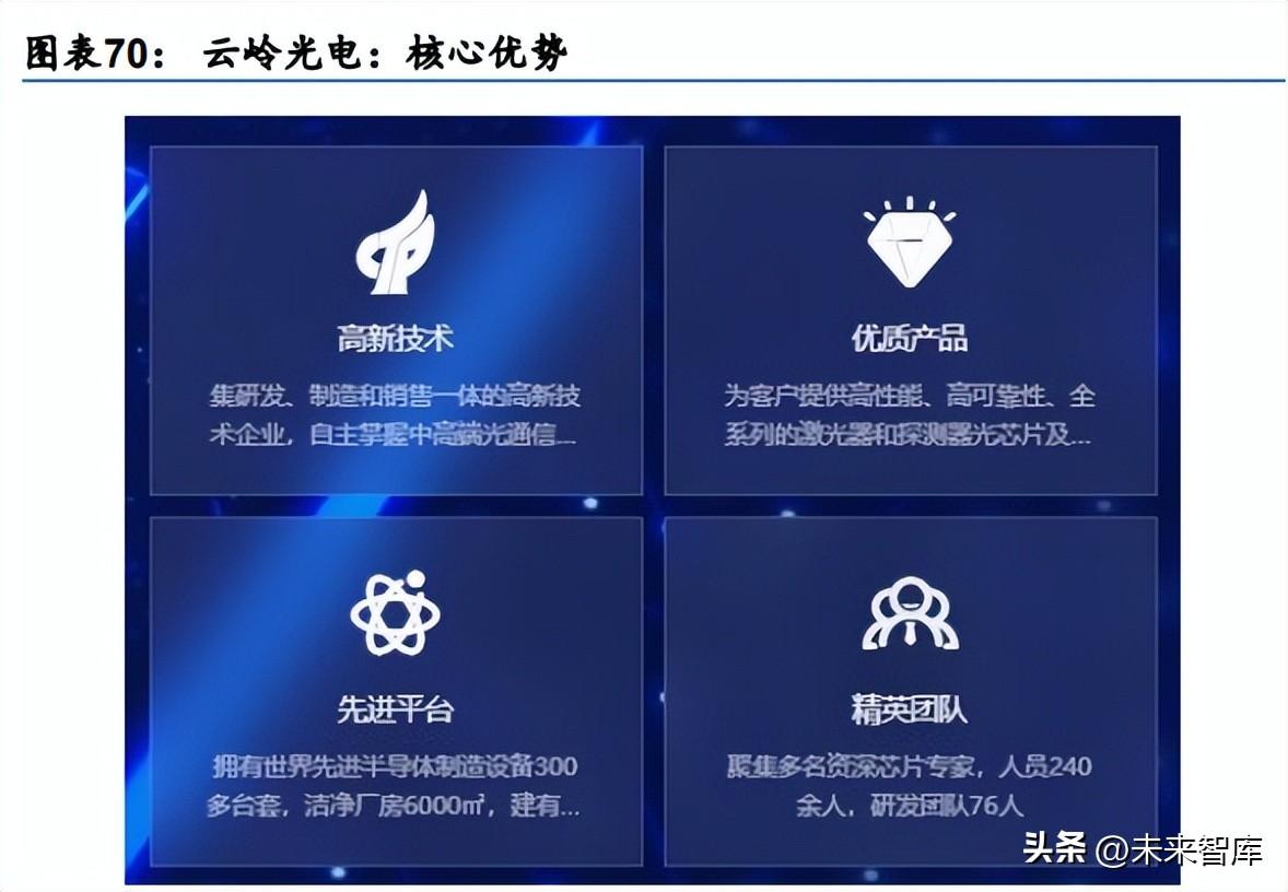 專(zhuan)注中高端(duan)光(guang)(guang)(guang)(guang)(guang)芯(xin)片市場,擁有自主(zhu)知識(shi)產權。武漢云嶺光(guang)(guang)(guang)(guang)(guang)電有限公(gong)司由國際領(ling)先(xian)的(de)(de)(de)芯(xin)片專(zhuan) 家(jia)團隊與華工(gong)(gong)科(ke)技(ji)(ji)于(yu) 2018 年 1 月共同發起設(she)立,承載近 20 年的(de)(de)(de)技(ji)(ji)術(shu)探(tan)索與市場實踐(jian),專(zhuan) 注于(yu)中高端(duan)光(guang)(guang)(guang)(guang)(guang)通信(xin)半導體(ti)光(guang)(guang)(guang)(guang)(guang)芯(xin)片產品,是擁有完全自主(zhu)知識(shi)產權,具備(bei)(bei)全流(liu)程生(sheng)(sheng)產能力的(de)(de)(de) IDM 光(guang)(guang)(guang)(guang)(guang)芯(xin)片企業(ye)。 云嶺光(guang)(guang)(guang)(guang)(guang)電主(zhu)營業(ye)務(wu)為(wei)(wei) 2.5G/10G/25G 全系(xi)列激光(guang)(guang)(guang)(guang)(guang)器(LD)和(he)探(tan)測(ce)器(PD)光(guang)(guang)(guang)(guang)(guang)芯(xin)片及(ji)封裝(zhuang)(zhuang)類 產品。公(gong)司建有光(guang)(guang)(guang)(guang)(guang)芯(xin)片研制(zhi)平臺,擁有 MOCVD 材料生(sheng)(sheng)長,器件工(gong)(gong)藝(yi)制(zhi)備(bei)(bei),和(he)后(hou)端(duan)測(ce)試(shi)封 裝(zhuang)(zhuang)的(de)(de)(de)完整生(sheng)(sheng)產線(xian),從海外引入(ru)具有國外光(guang)(guang)(guang)(guang)(guang)芯(xin)片大(da)廠多年工(gong)(gong)作經驗的(de)(de)(de)核(he)心(xin)技(ji)(ji)術(shu)團隊,掌握 10G/25G 高速率光(guang)(guang)(guang)(guang)(guang)收發芯(xin)片設(she)計、高質量材料生(sheng)(sheng)長、關鍵工(gong)(gong)藝(yi)制(zhi)備(bei)(bei)、和(he)封裝(zhuang)(zhuang)測(ce)試(shi)的(de)(de)(de)核(he)心(xin)技(ji)(ji) 術(shu)。公(gong)司具備(bei)(bei)年產芯(xin)片 7500 萬(wan)顆、TO 7200 萬(wan)只的(de)(de)(de)生(sheng)(sheng)產能力,致力于(yu)成為(wei)(wei)世界(jie)一(yi)流(liu)的(de)(de)(de)光(guang)(guang)(guang)(guang)(guang)芯(xin) 片企業(ye),為(wei)(wei)全球光(guang)(guang)(guang)(guang)(guang)通信(xin)企業(ye)提供優質全系(xi)列光(guang)(guang)(guang)(guang)(guang)芯(xin)片。