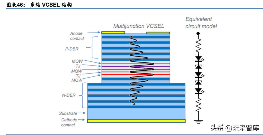 多結(jie)(jie) VCSEL 技(ji)術發(fa)展推動 VCSEL 在(zai)車(che)(che)載(zai)激光(guang)雷(lei)達領域的(de)(de)應用。車(che)(che)載(zai)激光(guang)雷(lei)達應用要(yao)求 VCSEL 需(xu)具有(you)較高(gao)的(de)(de)功率(lv)密(mi)度(du)(du)以(yi)實現(xian)長(chang)距(ju)離探測(ce),目前常用的(de)(de)提升功率(lv)密(mi)度(du)(du)的(de)(de)辦法(fa)為多結(jie)(jie) VCSEL 技(ji)術。多結(jie)(jie) VCSEL 技(ji)術在(zai)結(jie)(jie)構上通(tong)過(guo)周期性(xing)垂直地將幾個 PN 結(jie)(jie)疊(die)在(zai)一起,實現(xian)了 更(geng)高(gao)的(de)(de)光(guang)學效(xiao)率(lv)、更(geng)高(gao)的(de)(de)功率(lv)密(mi)度(du)(du)和更(geng)高(gao)的(de)(de)斜率(lv)效(xiao)率(lv),有(you)效(xiao)降低(di)器件的(de)(de)熱負荷和封裝(zhuang)尺寸。 2022年(nian)4月VCSEL巨頭Lumentum發(fa)布(bu)五(wu)結(jie)(jie)/六(liu)結(jie)(jie)VCSEL,最高(gao)功率(lv)密(mi)度(du)(du)超過(guo)1400W/mm2, 國(guo)內方(fang)面縱慧(hui)芯光(guang)、長(chang)光(guang)華(hua)芯等公司均已(yi)實現(xian)五(wu)結(jie)(jie) VCSEL 產品突破。