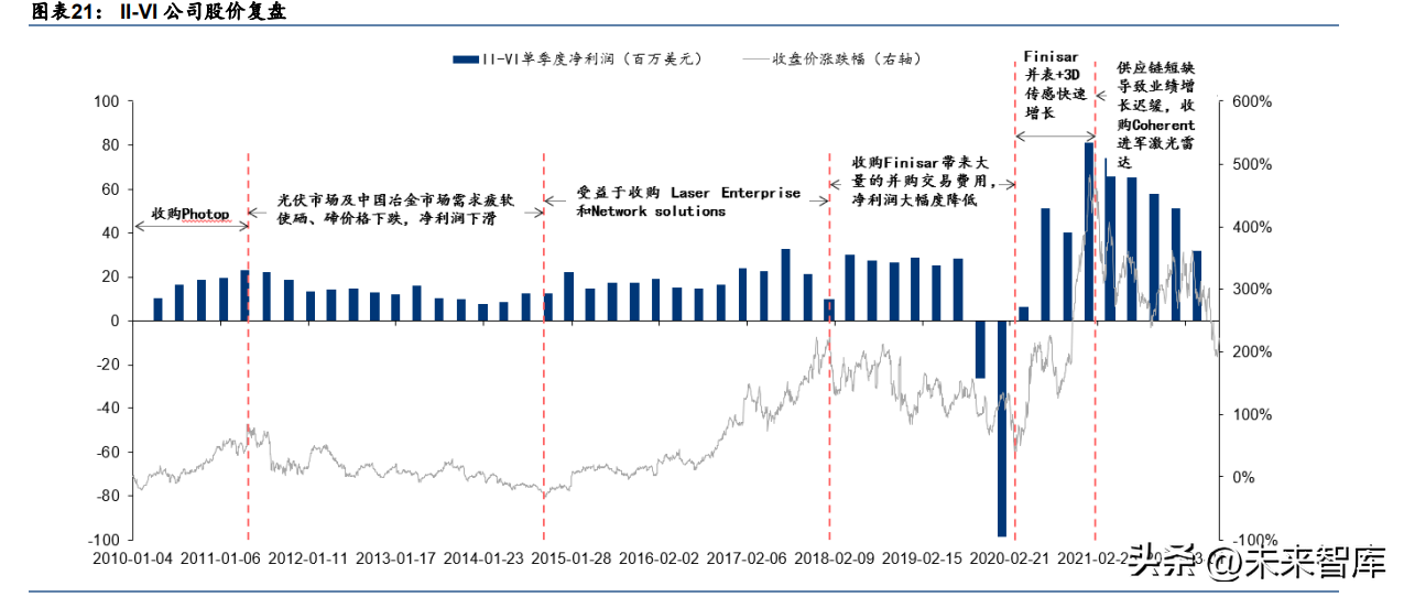 II-VI 公(gong)司成立于(yu)(yu) 1971 年(nian)(nian),于(yu)(yu) 1987 年(nian)(nian)登陸納斯(si)達克(ke)上市(shi)。II-VI 公(gong)司發(fa)展(zhan)初期(qi)業(ye)務聚焦于(yu)(yu)碲 化(hua)(hua)鎘(ge)等(deng) II-VI 族(zu)化(hua)(hua)學(xue)元(yuan)(yuan)素相關材料,用于(yu)(yu)二氧化(hua)(hua)碳激(ji)光(guang)(guang)器(qi)中(zhong)的核心(xin)光(guang)(guang)學(xue)元(yuan)(yuan)器(qi)件等(deng)。步入 20 世紀 90 年(nian)(nian)代后,II-VI 開(kai)始嘗試通過外(wai)延并購的方式實現(xian)業(ye)務領(ling)域(yu)的擴張,早期(qi)具(ju)有里程(cheng)碑 意義的收(shou)(shou)購包括 2000 年(nian)(nian) II-VI 收(shou)(shou)購 Laser Power Optics 公(gong)司,強化(hua)(hua)了自身(shen)在紅(hong)外(wai)光(guang)(guang)學(xue)領(ling)域(yu) 的競爭地位;以(yi)及(ji)(ji)(ji) 2010 年(nian)(nian)收(shou)(shou)購高意(Photop),該收(shou)(shou)購開(kai)啟了 II-VI 公(gong)司進軍光(guang)(guang)通信(xin)市(shi)場的 帷幕。近(jin)年(nian)(nian)來 II-VI 公(gong)司的重(zhong)要收(shou)(shou)購包括 2018 年(nian)(nian)收(shou)(shou)購全球光(guang)(guang)通信(xin)領(ling)域(yu)頭部(bu)公(gong)司 Finisar,以(yi) 及(ji)(ji)(ji) 2022 年(nian)(nian)收(shou)(shou)購全球激(ji)光(guang)(guang)器(qi)及(ji)(ji)(ji)激(ji)光(guang)(guang)設備(bei)領(ling)先(xian)企業(ye) Coherent 等(deng)。下文(wen)中(zhong)我們重(zhong)點(dian)對 2010 年(nian)(nian) 后(即收(shou)(shou)購高意后)II-VI 公(gong)司發(fa)展(zhan)歷程(cheng)進行復盤,分析各階段其業(ye)績變化(hua)(hua)背后的驅(qu)動(dong)因素 及(ji)(ji)(ji)股價表現(xian)。