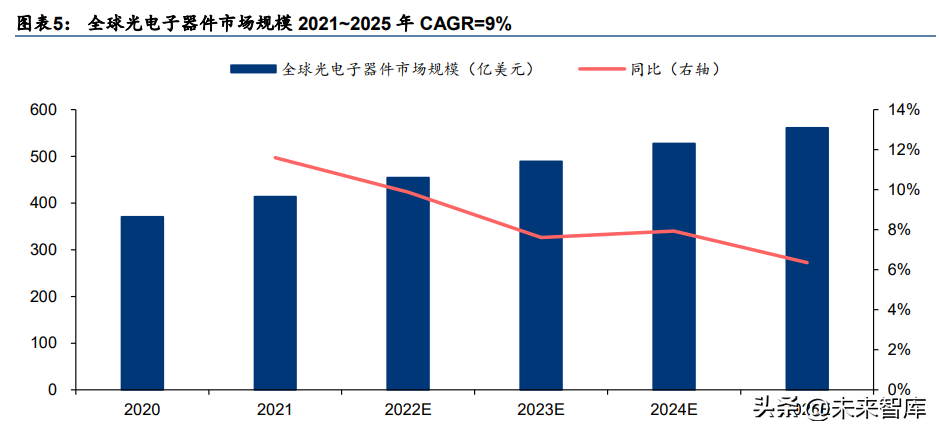 全球光電子器件(jian)市(shi)場(chang)(chang)規(gui)(gui)模(mo)(mo)(mo)持續增長,2025 年(nian)(nian)市(shi)場(chang)(chang)規(gui)(gui)模(mo)(mo)(mo)有(you)望(wang)突(tu)破 560 億美(mei)元。光芯(xin)(xin)片(pian)涵(han)蓋(gai)工 業(ye)用(yong)高功率(lv)激光芯(xin)(xin)片(pian)、通信用(yong)高速率(lv)激光芯(xin)(xin)片(pian)、手機人臉(lian)識別(bie)用(yong) VCSEL 等(deng)(deng)成熟應(ying)用(yong),以及 車用(yong)激光雷達(da)(da)和(he)硅光芯(xin)(xin)片(pian)等(deng)(deng)未來有(you)望(wang)實現爆發性增長的新(xin)領(ling)域(yu)。我們認為在通信、工業(ye)等(deng)(deng) 領(ling)域(yu)的應(ying)用(yong)深化,以及在車載(zai)激光雷達(da)(da)等(deng)(deng)新(xin)興領(ling)域(yu)的拓展,光芯(xin)(xin)片(pian)市(shi)場(chang)(chang)規(gui)(gui)模(mo)(mo)(mo)有(you)望(wang)持續增長。 根據 Gartner 數據,2021 年(nian)(nian)全球光芯(xin)(xin)片(pian)(含 CCD、CIS、LED、光子探測器、光耦合器、 激光芯(xin)(xin)片(pian)等(deng)(deng))市(shi)場(chang)(chang)規(gui)(gui)模(mo)(mo)(mo)達(da)(da) 414 億美(mei)元,預計 2025 年(nian)(nian)市(shi)場(chang)(chang)規(gui)(gui)模(mo)(mo)(mo)有(you)望(wang)達(da)(da) 561 億美(mei)元,對應(ying)期 間 CAGR=9%。
