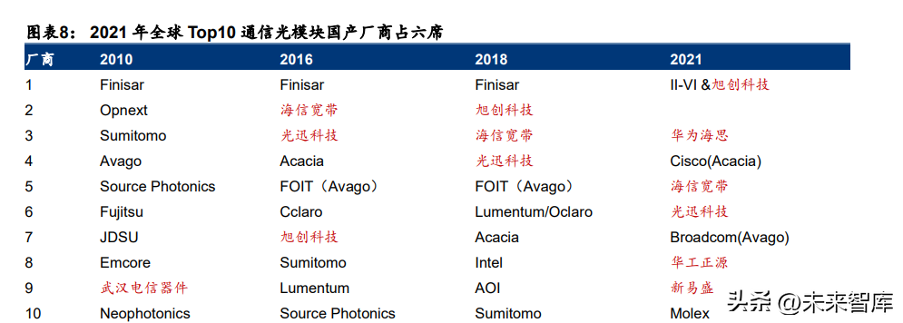光(guang)(guang)模塊(kuai)、光(guang)(guang)纖(xian)(xian)激光(guang)(guang)器、激光(guang)(guang)雷達等(deng)產業鏈中(zhong)下(xia)(xia)游環節國(guo)產化進展順利。目前我(wo)國(guo)光(guang)(guang)模塊(kuai)、 光(guang)(guang)纖(xian)(xian)激光(guang)(guang)器、激光(guang)(guang)雷達等(deng)下(xia)(xia)游細(xi)分領域已具備較強(qiang)競(jing)爭(zheng)實(shi)力,推動相關領域國(guo)產化進展持 續邁進。 光(guang)(guang)模塊(kuai)方面,根(gen)據(ju) Lightcounting 于 2022 年 5 月發布的(de)統計數據(ju),2021 年全(quan)球前十大(da)光(guang)(guang)模 塊(kuai)廠(chang)商(shang)(shang),中(zhong)國(guo)廠(chang)商(shang)(shang)占據(ju)六(liu)席(xi),分別為旭創(與 II-VI 并列第(di)一)、華為海思(si)(第(di)三(san))、海信(xin)寬 帶(第(di)五)、光(guang)(guang)迅科技(ji)(ji)(第(di)六(liu))、華工正源(第(di)八(ba))及(ji)新易盛(sheng)(第(di)九);相比于 2010 年全(quan)球 前十大(da)廠(chang)商(shang)(shang)主要為海外廠(chang)商(shang)(shang),國(guo)內僅 WTD(武(wu)漢電(dian)信(xin)器件有限公(gong)司,2012 年與光(guang)(guang)迅科技(ji)(ji) 合并)一家(jia)公(gong)司入圍,體現出十年以來國(guo)產光(guang)(guang)模塊(kuai)廠(chang)商(shang)(shang)競(jing)爭(zheng)實(shi)力及(ji)市場地位的(de)快速(su)提升(sheng);