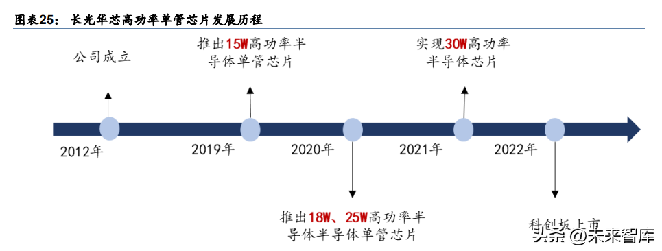 激(ji)光(guang)芯(xin)(xin)片廠商通過(guo)持續提升產品(pin)輸出功(gong)率(lv)(lv)鞏固競爭實力。以(yi)國(guo)產高(gao)功(gong)率(lv)(lv)半導體激(ji)光(guang)芯(xin)(xin)片廠 商長(chang)光(guang)華芯(xin)(xin)產品(pin)發展歷程來看(kan),長(chang)光(guang)華芯(xin)(xin)成立于(yu) 2012 年(nian),成立之初研發出 13W 以(yi)上高(gao)亮 度單(dan)管芯(xin)(xin)片;2019 年(nian)推出 15W 單(dan)管芯(xin)(xin)片,2020 年(nian)推出 18W、25W 單(dan)管芯(xin)(xin)片,2021 年(nian)實 現 30W 單(dan)管芯(xin)(xin)片量(liang)產,產品(pin)向更高(gao)功(gong)率(lv)(lv)段(duan)持續快速迭代。