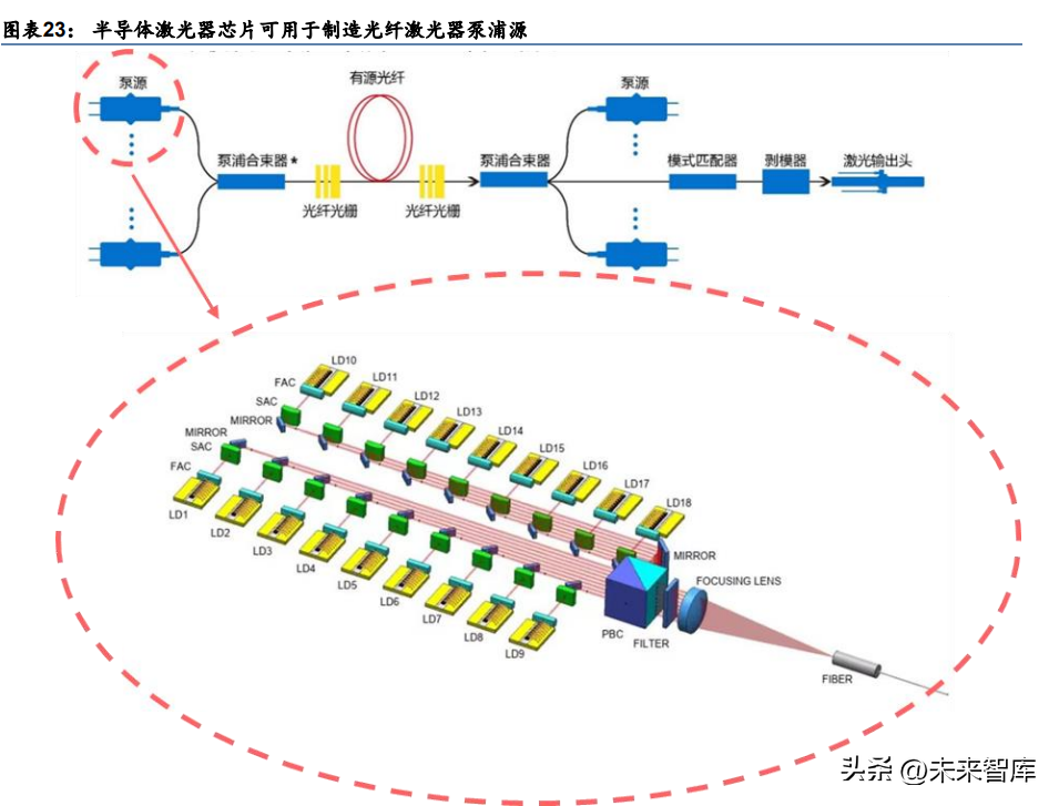 高(gao)功率半(ban)導(dao)(dao)體(ti)(ti)激(ji)(ji)光(guang)(guang)(guang)芯片:激(ji)(ji)光(guang)(guang)(guang)器(qi)(qi)(qi)泵(beng)浦源(yuan)核心(xin)上(shang)(shang)游。高(gao)功率半(ban)導(dao)(dao)體(ti)(ti)激(ji)(ji)光(guang)(guang)(guang)器(qi)(qi)(qi)芯片可用于制造(zao)光(guang)(guang)(guang) 纖激(ji)(ji)光(guang)(guang)(guang)器(qi)(qi)(qi)和固(gu)體(ti)(ti)激(ji)(ji)光(guang)(guang)(guang)器(qi)(qi)(qi)泵(beng)浦源(yuan),其工作原(yuan)理是通過對激(ji)(ji)光(guang)(guang)(guang)工作物質的激(ji)(ji)勵和抽運(yun)激(ji)(ji)活粒(li)子 到高(gao)能級(ji),從(cong)而實現(xian)粒(li)子數反轉。半(ban)導(dao)(dao)體(ti)(ti)激(ji)(ji)光(guang)(guang)(guang)泵(beng)浦源(yuan)主(zhu)要由 COS 芯片(激(ji)(ji)光(guang)(guang)(guang)芯片、熱沉等)、 殼體(ti)(ti)及(ji)其他材(cai)料(liao)組成(cheng),根據(ju)《激(ji)(ji)光(guang)(guang)(guang)制造(zao)商(shang)情》(2020 年(nian) 08 月刊 130 期(qi)),泵(beng)浦源(yuan)成(cheng)本可占 光(guang)(guang)(guang)纖激(ji)(ji)光(guang)(guang)(guang)器(qi)(qi)(qi)總成(cheng)本比例的 50%以上(shang)(shang)。