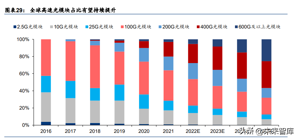 行(xing)業(ye)未來有望向更高(gao)(gao)(gao)調制(zhi)速(su)率(lv)(lv)發(fa)展(zhan)。調制(zhi)速(su)率(lv)(lv)是(shi)衡量(liang)(liang)高(gao)(gao)(gao)速(su)率(lv)(lv)激光(guang)(guang)芯(xin)片性能的(de)(de)(de)核(he)心指標之一, 其(qi)指的(de)(de)(de)是(shi)信號被調制(zhi)以(yi)后在單位時(shi)間內(nei)的(de)(de)(de)變(bian)化(hua),即單位時(shi)間內(nei)載波參數變(bian)化(hua)的(de)(de)(de)次(ci)數,它是(shi) 對(dui)符號傳(chuan)輸速(su)率(lv)(lv)的(de)(de)(de)一種(zhong)度量(liang)(liang)。光(guang)(guang)芯(xin)片的(de)(de)(de)調制(zhi)速(su)率(lv)(lv)較大程度上決定了光(guang)(guang)模塊向高(gao)(gao)(gao)速(su)率(lv)(lv)演進的(de)(de)(de) 速(su)度。按(an)照調制(zhi)速(su)率(lv)(lv)的(de)(de)(de)不(bu)同,高(gao)(gao)(gao)速(su)率(lv)(lv)激光(guang)(guang)芯(xin)片可分為 2.5G、10G、25G 及以(yi)上各速(su)率(lv)(lv)光(guang)(guang)芯(xin) 片,光(guang)(guang)芯(xin)片調制(zhi)速(su)率(lv)(lv)越(yue)高(gao)(gao)(gao),對(dui)應的(de)(de)(de)光(guang)(guang)模塊單位時(shi)間傳(chuan)輸信號量(liang)(liang)越(yue)大。隨著更高(gao)(gao)(gao)速(su)率(lv)(lv)光(guang)(guang)模塊 的(de)(de)(de)持(chi)續發(fa)展(zhan),預計(ji)將(jiang)帶動更高(gao)(gao)(gao)速(su)率(lv)(lv)激光(guang)(guang)芯(xin)片需求的(de)(de)(de)釋放。