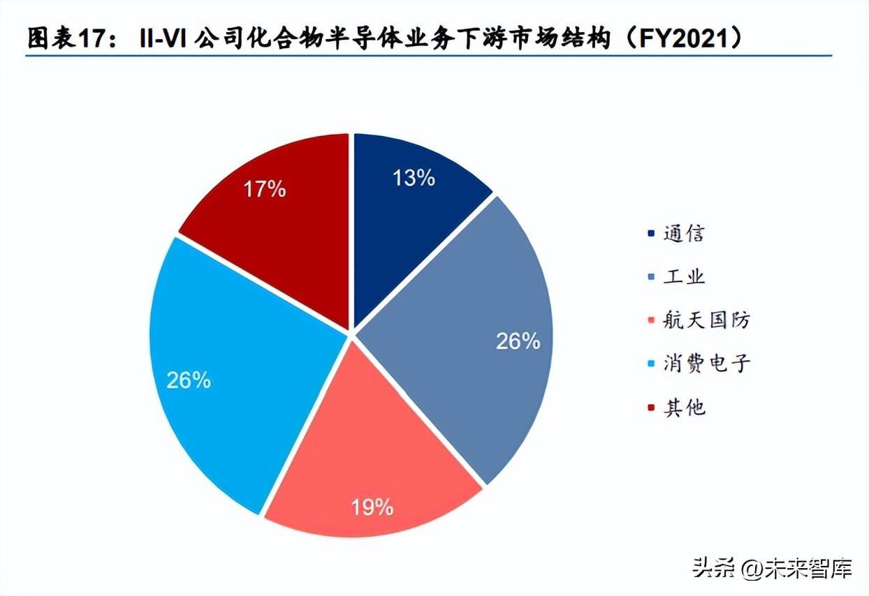 II-VI、Lumentum 等(deng)(deng)廠商(shang)市(shi)場布(bu)(bu)局(ju)全面(mian)(mian),通信(xin)、工業(ye)、消(xiao)費(fei)、國防等(deng)(deng)全面(mian)(mian)布(bu)(bu)局(ju)。根據我們 的梳理(li),II-VI、Lumentum 等(deng)(deng)海(hai)(hai)外(wai)領先的光芯片/光器件廠商(shang)布(bu)(bu)局(ju)的市(shi)場領域(yu)(yu)較為(wei)(wei)全面(mian)(mian),其 中 Lumentum 公司 2021 財(cai)年營(ying)收(shou)為(wei)(wei) 17.4 億(yi)美(mei)元,同比增長 3.8%;業(ye)務結(jie)構方面(mian)(mian),電信(xin)& 數通產品、工業(ye)&消(xiao)費(fei)產品、激光器產品營(ying)收(shou)占比分(fen)(fen)別為(wei)(wei) 61%、32%、7%。II-VI 公司方面(mian)(mian), 2021 財(cai)年營(ying)收(shou)為(wei)(wei) 31.1 億(yi)美(mei)元,同比增長 30.5%;業(ye)務結(jie)構方面(mian)(mian),總體可(ke)分(fen)(fen)為(wei)(wei)光子(zi)解決方 案(an)和化合物半(ban)導體兩大板塊(kuai),其中化合物半(ban)導體業(ye)務所切(qie)入的下游(you)領域(yu)(yu)中,消(xiao)費(fei)電子(zi)市(shi)場、 工業(ye)市(shi)場營(ying)收(shou)貢(gong)獻(xian)均約為(wei)(wei) 26%,其次分(fen)(fen)別為(wei)(wei)國防(19%)、通信(xin)(13%)、其他(包(bao)含醫療(liao)、 汽車(che)電子(zi)等(deng)(deng),約占 17%)。可(ke)以看到海(hai)(hai)外(wai)光芯片/光器件廠商(shang)所切(qie)入的下游(you)市(shi)場中,通信(xin)、 工業(ye)、消(xiao)費(fei)、國防等(deng)(deng)領域(yu)(yu)均實(shi)現了較為(wei)(wei)全面(mian)(mian)的布(bu)(bu)局(ju)。