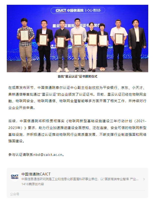 2022 年 8 月 16 日,由中國信息通信研究院(以下簡稱“中國信通院”)主辦的主題為“星聯萬物,云創未來”的“2022 物聯網產業發展大會”召開,為首(shou)批通過中國(guo)信通院“星(xing)云認證”的企業頒發了認證證書。