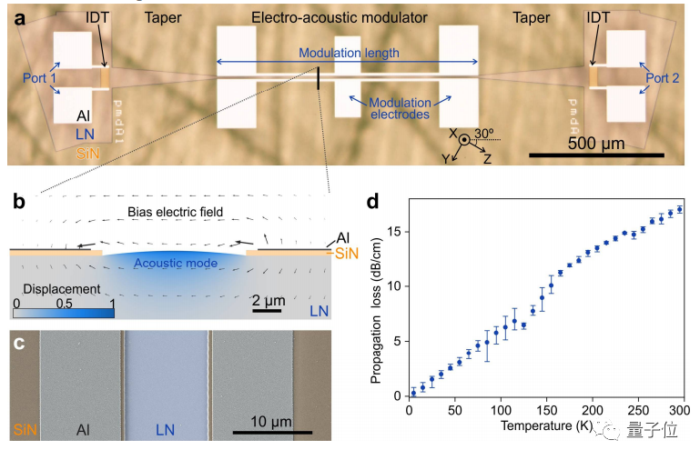因此,哈佛團隊的電-聲調制器是在一個集成的鈮酸鋰(LN)平臺(tai)上(shang)制作的,b圖可以清(qing)楚地看到(dao),SiN在LN基(ji)板上(shang)沉積,中間(jian)形成了聲波(bo)的波(bo)導。