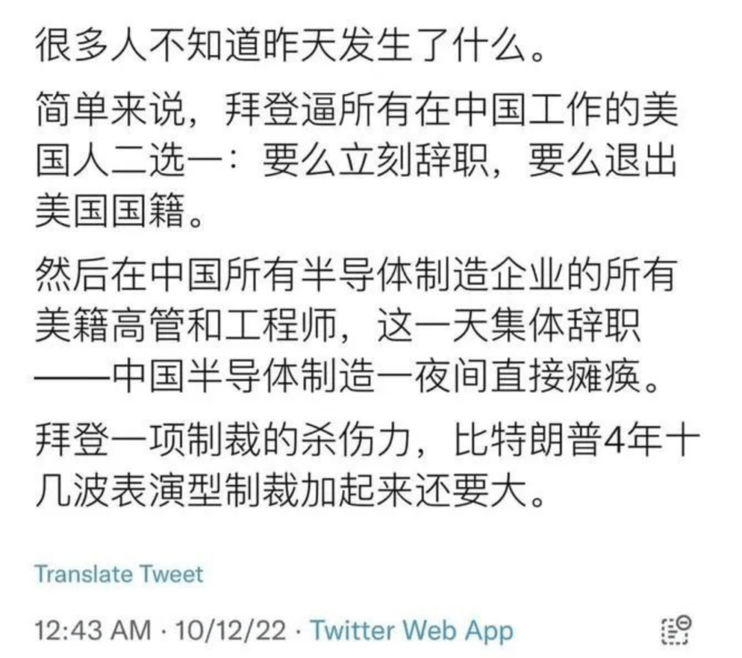 為防止(zhi)中國(guo)取得關鍵技術,拜登(deng)政府上周出(chu)臺新規,嚴格管控對(dui)中國(guo)的(de)先(xian)進(jin)(jin)半(ban)導體技術和(he)設備出(chu)口,禁止(zhi)中國(guo)公司(si)購買先(xian)進(jin)(jin)晶片(pian)制(zhi)造設備,在未(wei)經許可和(he)沒有執照的(de)情況下,中國(guo)也無法雇用(yong)美國(guo)公民進(jin)(jin)行先(xian)進(jin)(jin)芯片(pian)研發(fa)。