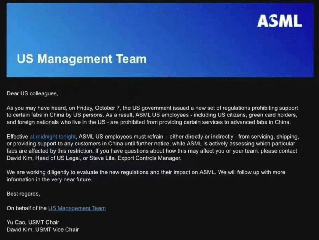 從今(jin)晚午(wu)夜開始,ASML的(de)美國(guo)(guo)員(yuan)工必須避免直接(jie)(jie)或間接(jie)(jie)地為中國(guo)(guo)的(de)任(ren)何客戶(hu)提供服務、運(yun)輸或支持(chi),直至(zhi)另行通知,而ASML正在積(ji)極(ji)評估哪些(xie)特定晶圓廠受到此(ci)限制的(de)影(ying)響(xiang)。如果(guo)您對(dui)這個法(fa)規如何影(ying)響(xiang)您或團(tuan)隊(dui)有(you)疑(yi)問。請(qing)聯系美國(guo)(guo)法(fa)律主管(guan) David Kim或出口控制經理 Steve Lita。