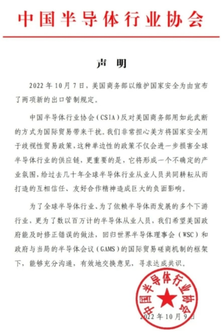 就(jiu)在(zai)今天上午(wu),中國半導(dao)體行業協會(CSIA)發(fa)布聲明,反對美國商務部的(de)出(chu)口管制條例。