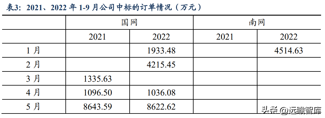 2)2022 年(nian) 1-9 月,1000 萬(wan)以上(shang)的(de)訂單(dan)(dan)信(xin)息中(公司(si)僅公告 1000 萬(wan)金額(e)以上(shang)訂單(dan)(dan)),來(lai)自于國(guo)網(wang)的(de)訂單(dan)(dan)合(he)(he)計 5.15 億(yi)元、同(tong)比(bi)增長(chang) 93.76%;來(lai)自于南網(wang)的(de)訂單(dan)(dan)合(he)(he)計 1.02 億(yi)元、同(tong)比(bi)增長(chang) 155.59%;全(quan)部加(jia)總(zong)后(hou)(包(bao)括(kuo)兩(liang)網(wang)客戶和(he)兩(liang)網(wang)之外客戶)訂單(dan)(dan)金額(e)合(he)(he)計 7.21 億(yi)元、同(tong)比(bi)增長(chang) 57.91%。