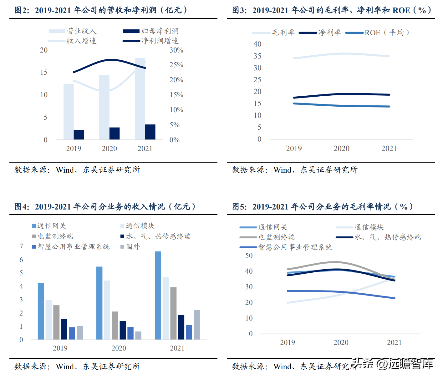 2019-2021 年(nian),公司營收分(fen)(fen)(fen)別為(wei)(wei) 12.44、14.49、18.26 億(yi)元(yuan),增速(su)分(fen)(fen)(fen)別為(wei)(wei) 19.78%、16.44%、26.03%,3 年(nian) CAGR 為(wei)(wei) 20.68%;歸母凈(jing)利潤(run)分(fen)(fen)(fen)別為(wei)(wei) 2.17、2.75、3.41 億(yi)元(yuan),增速(su)分(fen)(fen)(fen)別為(wei)(wei) 22.77%、26.65%、24.02%,3 年(nian) CAGR 為(wei)(wei) 24.43%;毛利率分(fen)(fen)(fen)別為(wei)(wei) 34.05%、36.03%、34.93%,凈(jing)利率分(fen)(fen)(fen)別為(wei)(wei) 17.50%、19.05%、18.75%,ROE(平(ping)均)分(fen)(fen)(fen)別為(wei)(wei) 15.05%、 14.07%、13.77%,總體來(lai)看盈利能力較為(wei)(wei)穩(wen)定。分(fen)(fen)(fen)業務來(lai)看: