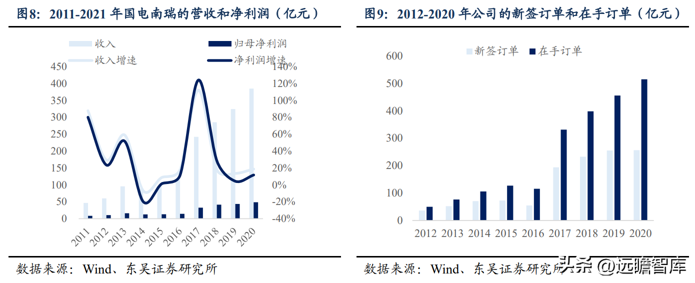2009-2020 年(nian),公司(si)營收(shou)從(cong) 17.79 億(yi)(yi)(yi)元增(zeng)長至 385.02 億(yi)(yi)(yi)元,CAGR 為(wei) 32.25%;歸(gui)母(mu)凈利潤從(cong) 2.50 億(yi)(yi)(yi)元增(zeng)長至 48.52 億(yi)(yi)(yi)元,CAGR 為(wei) 30.95%;在堅(jian)強智能電(dian)網建設的(de)(de)過程(cheng)中,雖然總投資完成(cheng)額增(zeng)速從(cong)兩位數降至一(yi)位數,但是智能電(dian)網投資的(de)(de)力度(du)顯著(zhu)增(zeng)強,國(guo)電(dian)南瑞的(de)(de)訂單仍然實現兩位數以上的(de)(de)高(gao)速增(zeng)長,2012-2020 年(nian),公司(si)新簽訂單從(cong) 36.38 億(yi)(yi)(yi)元增(zeng)長至 256.58 億(yi)(yi)(yi)元,CAGR 為(wei) 27.66%;