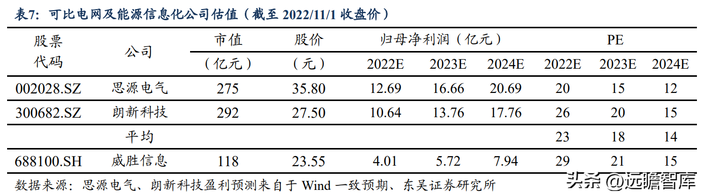 我(wo)們預計公(gong)(gong)司 2022-2024 年 EPS 分別為(wei) 0.80、1.14、1.59 元,對應 PE 為(wei) 29、21、15 倍,我(wo)們選取(qu)同(tong)樣以電(dian)網作(zuo)為(wei)主(zhu)要(yao)客戶或者主(zhu)要(yao)從事能源信息化的思源電(dian)氣、朗新科技作(zuo)為(wei)可比公(gong)(gong)司,雖(sui)然公(gong)(gong)司估值高(gao)于(yu)可比公(gong)(gong)司平均估值,但是(shi)考慮到: