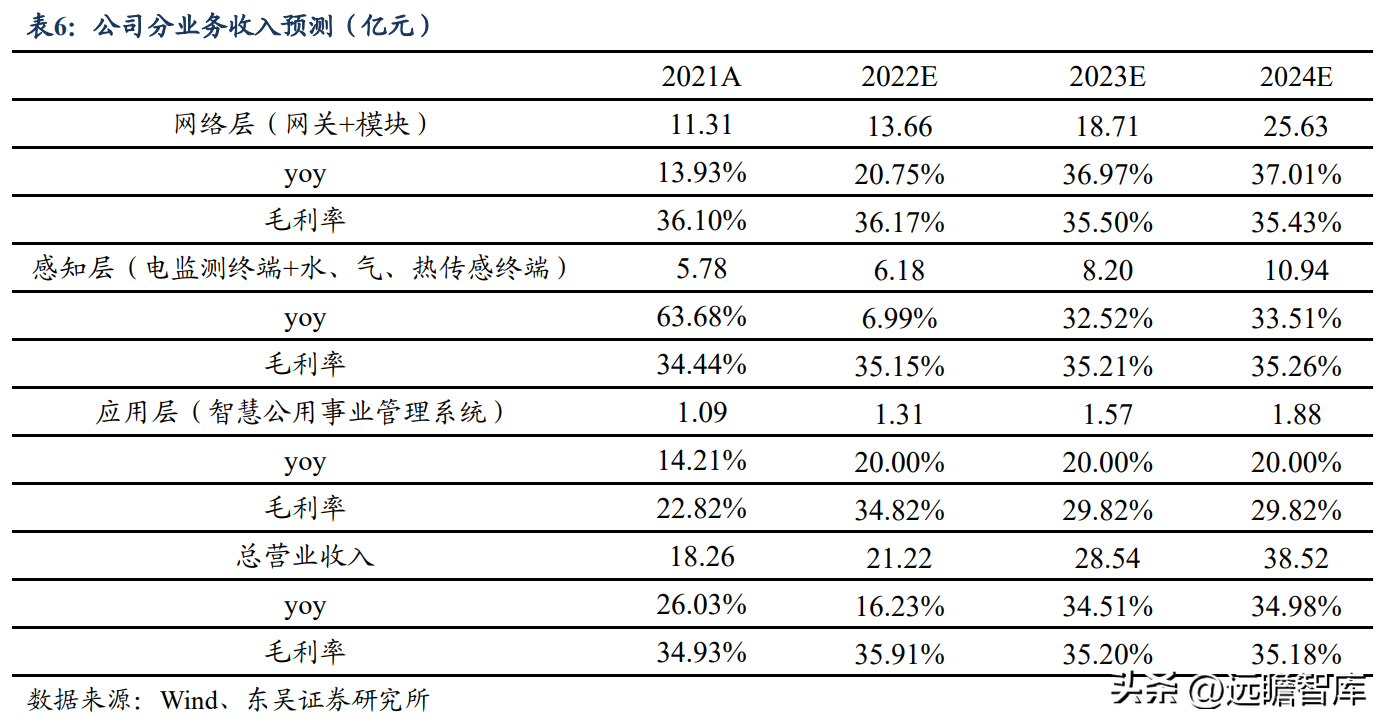2)水、氣、熱傳感終端:2022-2024 年收入分別(bie)(bie)為 1.85、2.13、2.45 億元,增速分別(bie)(bie)為 0.00%、15.00%、15.00%,毛利率(lv)分別(bie)(bie)為 34.10%、34.10%、34.10%;