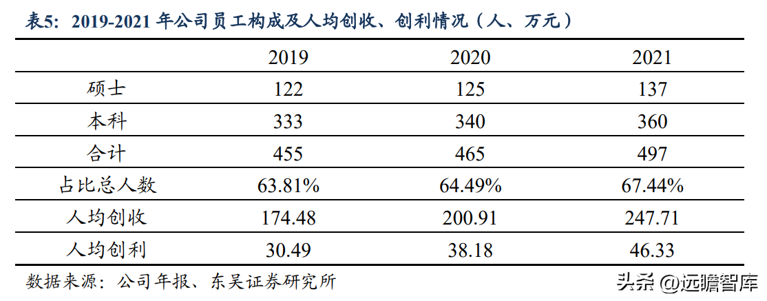 從全公(gong)司的人(ren)員(yuan)構成來看,2019-2021 年,碩士+本科員(yuan)工數量(liang)分(fen)別(bie)(bie)為 455、465、497 人(ren),占比總人(ren)數分(fen)別(bie)(bie)為 63.81%、64.49%、67.44%,公(gong)司人(ren)均(jun)創(chuang)收分(fen)別(bie)(bie)為 174.48、200.91、247.71 萬元,人(ren)均(jun)創(chuang)利(li)分(fen)別(bie)(bie)為 30.49、38.18、46.33 萬元,人(ren)效逐年提升。