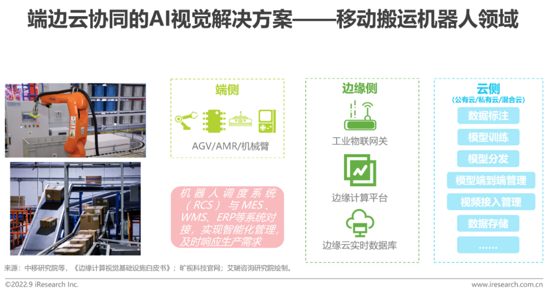 在(zai)云計算(suan)時(shi)代興起(qi)以前,圖像數據(ju)(ju)主要為本(ben)地(di)化處理,而隨著(zhu)云計算(suan)服務(wu)發展,將端(duan)(duan)(duan)(duan)側(ce)設備部(bu)署在(zai)本(ben)地(di),算(suan)法放置(zhi)在(zai)云端(duan)(duan)(duan)(duan)的(de)(de)(de)(de)產(chan)品(pin)架構(gou)可以有效(xiao)實(shi)現端(duan)(duan)(duan)(duan)側(ce)的(de)(de)(de)(de)空(kong)間節約(yue)、部(bu)署的(de)(de)(de)(de)成本(ben)降低及算(suan)法的(de)(de)(de)(de)實(shi)時(shi)更新。因此云端(duan)(duan)(duan)(duan)協同(tong)廣泛滲透到各行(xing)業產(chan)品(pin)應(ying)(ying)用(yong)中(zhong),但該產(chan)品(pin)結構(gou)下(xia),端(duan)(duan)(duan)(duan)側(ce)數據(ju)(ju)均需回傳到云端(duan)(duan)(duan)(duan)做處理,適(shi)用(yong)場景(jing)需對時(shi)延(yan)要求較低,存在(zai)數據(ju)(ju)傳輸(shu)(shu)量大(da)、能耗高(gao)等(deng)問題。深度神經網絡(luo)的(de)(de)(de)(de)技術發展與(yu)模型應(ying)(ying)用(yong)又(you)進一步加大(da)了數據(ju)(ju)傳輸(shu)(shu)量,AI攝像頭便(bian)在(zai)此背景(jing)下(xia)應(ying)(ying)運而生,構(gou)建(jian)起(qi)初步的(de)(de)(de)(de)云“邊(bian)(bian)(bian)”端(duan)(duan)(duan)(duan)協同(tong),由內置(zhi)AI算(suan)法的(de)(de)(de)(de)攝像頭實(shi)現前置(zhi)化的(de)(de)(de)(de)數據(ju)(ju)處理,初步成為邊(bian)(bian)(bian)緣側(ce)。值得注意的(de)(de)(de)(de)是,AI攝像頭出于功(gong)耗、散熱等(deng)因素考量,不會內置(zhi)過多算(suan)法,可處理簡要前端(duan)(duan)(duan)(duan)場景(jing)。若對時(shi)延(yan)要求高(gao)且算(suan)法需求復雜的(de)(de)(de)(de)應(ying)(ying)用(yong)場景(jing),則需搭建(jian)邊(bian)(bian)(bian)緣盒子或邊(bian)(bian)(bian)緣服務(wu)器,構(gou)建(jian)邊(bian)(bian)(bian)緣側(ce),實(shi)現云、邊(bian)(bian)(bian)、端(duan)(duan)(duan)(duan)的(de)(de)(de)(de)相互協同(tong)。本(ben)篇報告根據(ju)(ju)行(xing)業特點與(yu)場景(jing)需求,將安防、工業、零(ling)售(shou)、機器人、農業領(ling)域劃定(ding)為產(chan)品(pin)應(ying)(ying)用(yong)的(de)(de)(de)(de)研(yan)究范(fan)圍。