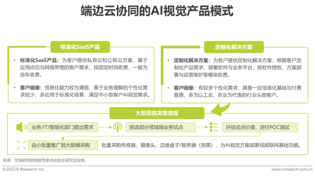 隨(sui)著人(ren)工智能深度學習算(suan)法(fa)的(de)快速成(cheng)熟,中國誕生了一批(pi)深耕于AI視(shi)覺(jue)算(suan)法(fa)技(ji)術的(de)人(ren)工智能企(qi)業。總(zong)結來看,提供(gong)AI視(shi)覺(jue)產(chan)品(pin)(pin)的(de)市場參與廠(chang)商(shang)眾多,主要包括大(da)型云(yun)服務廠(chang)商(shang)(阿里云(yun)、騰訊云(yun)、百度云(yun)、華為云(yun)等(deng)(deng))、AI視(shi)覺(jue)算(suan)法(fa)廠(chang)商(shang)(商(shang)湯(tang)、曠視(shi)、云(yun)天勵飛、進(jin)化(hua)動(dong)力(li)等(deng)(deng))以(yi)及傳統安防廠(chang)商(shang)(海(hai)康威視(shi)、大(da)華股份、宇視(shi)科技(ji)等(deng)(deng))。各(ge)家(jia)以(yi)AI技(ji)術積累、渠道經驗(yan)、產(chan)品(pin)(pin)特性為市場切入點,選擇(ze)一個(ge)(ge)或多個(ge)(ge)垂直(zhi)業務領域。以(yi)安防、零售、金融、車聯網、機器人(ren)、農業等(deng)(deng)為例,提供(gong)端(duan)邊云(yun)協(xie)同(tong)架構的(de)AI視(shi)覺(jue)產(chan)品(pin)(pin)方案(an)。AI視(shi)覺(jue)產(chan)品(pin)(pin)模式一般可(ke)分(fen)為標準化(hua)SaaS產(chan)品(pin)(pin)與定(ding)制化(hua)解決方案(an)兩類,行業客戶需(xu)根據自身IT信息化(hua)水平、需(xu)求(qiu)定(ding)制化(hua)程(cheng)度、產(chan)品(pin)(pin)付費意愿、適用場景需(xu)求(qiu)等(deng)(deng)因素考量選擇(ze),對(dui)應完成(cheng)端(duan)側、邊緣側及云(yun)側的(de)產(chan)品(pin)(pin)部(bu)署。