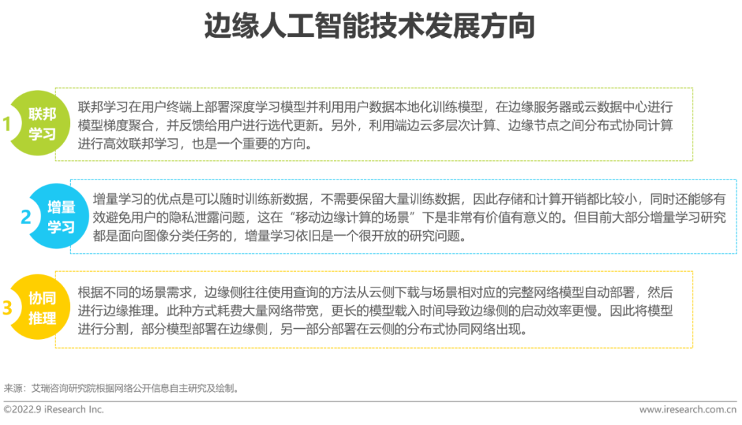 端邊(bian)云協同(tong)的技(ji)術與生態(tai)趨勢:1)端(duan)(duan)邊(bian)云協同的AI視(shi)覺產業(ye)發(fa)(fa)展依(yi)賴于聯邦學(xue)(xue)習、增量學(xue)(xue)習、協同推理(li)等邊(bian)緣AI技術發(fa)(fa)展;2)端(duan)(duan)邊(bian)云協同的AI視(shi)覺應(ying)(ying)用(yong)對算力(li)和網絡(luo)部署提出(chu)了要求,算力(li)網絡(luo)技術發(fa)(fa)展將助力(li)超低(di)時(shi)延(yan)類(lei)AI視(shi)覺應(ying)(ying)用(yong);3)邊(bian)緣計(ji)算將進(jin)(jin)入(ru)黃金發(fa)(fa)展期(qi),在滿足靈(ling)活響應(ying)(ying)、敏捷部署、時(shi)延(yan)成本的業(ye)務(wu)需求外,未來需進(jin)(jin)一步關注邊(bian)緣服務(wu)的安(an)全、可靠、可信等能(neng)力(li),構建(jian)“可信邊(bian)緣計(ji)算”生態。