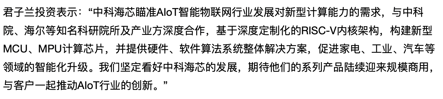 中科海芯成立于2020年,核心聚焦智能控制、智能人機交互等應用方向,研發和銷售RISC-V計算芯片及軟硬件解決方案,以滿足智能家居、智能制造、汽車電子和AIoT融(rong)合(he)產(chan)業場(chang)景(jing)引發的新型計算需求。公司(si)目前通(tong)過(guo)自研RISC-V芯(xin)(xin)片敏捷開(kai)發平臺(tai),成功(gong)開(kai)發了(le)32位/64位MCU、MPU芯(xin)(xin)片等產(chan)品,獲得相關知識產(chan)權十(shi)數項。
