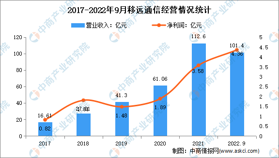 上(shang)海移遠(yuan)通(tong)信(xin)技術股(gu)份有限公(gong)司主營業務(wu)是從事物聯網領域無線通(tong)信(xin)模(mo)(mo)(mo)組(zu)(zu)及其解決(jue)方(fang)案(an)的設計、生產、研發與銷售服務(wu)。主要產品類型包(bao)括GSM/GPRS模(mo)(mo)(mo)組(zu)(zu)(2G模(mo)(mo)(mo)組(zu)(zu))、WCDMA/HSPA模(mo)(mo)(mo)組(zu)(zu)(3G模(mo)(mo)(mo)組(zu)(zu))、LTE模(mo)(mo)(mo)組(zu)(zu)(4G模(mo)(mo)(mo)組(zu)(zu))、LPWA模(mo)(mo)(mo)組(zu)(zu)、5G模(mo)(mo)(mo)組(zu)(zu)、GNSS定位模(mo)(mo)(mo)組(zu)(zu)、Wi-Fi模(mo)(mo)(mo)組(zu)(zu)以及天線等。2022年(nian)1-9月移遠(yuan)通(tong)信(xin)營業收(shou)入達101.4億(yi)(yi)元(yuan),實現凈利潤4.36億(yi)(yi)元(yuan)。