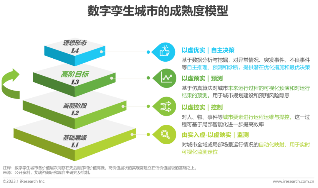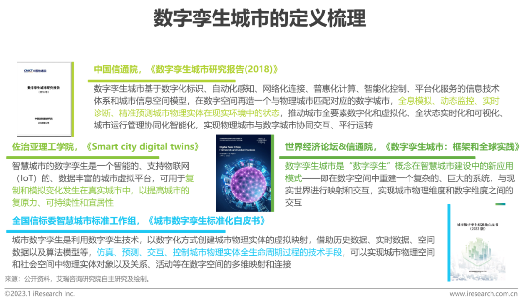 無論是數字孿生還是數字孿生城市,其定義都在專家、學者和相關從業人員的研究與實踐中不斷的優化調整。相較于數字孿生,數字孿生城市圈定了“城市”這一地理空間范圍,內涵定義脫離了抽象理念,扎根于“智慧城市”這一優渥土壤,數字孿生城市的原理、功能、預期用途和受益方也更為清晰明朗。通過融合、提煉現有報告內容成果,解構數字孿生城市的內涵特征,艾瑞認為數字(zi)孿生城市(shi)(shi)是(shi)指在數字(zi)世界中創建一個同(tong)物理實(shi)體城市(shi)(shi)外觀(guan)一致、行(xing)(xing)動一致、思想一致的(de)(de)數字(zi)虛(xu)擬城市(shi)(shi),實(shi)現對現實(shi)世界的(de)(de)監(jian)測、診斷、回溯(su)、預(yu)測和決策控制,用于實(shi)體城市(shi)(shi)的(de)(de)規劃(hua)、建設、治理和優化等全生命周期管理,提高城市(shi)(shi)運行(xing)(xing)效率(lv)和市(shi)(shi)民(min)居(ju)住(zhu)體驗。