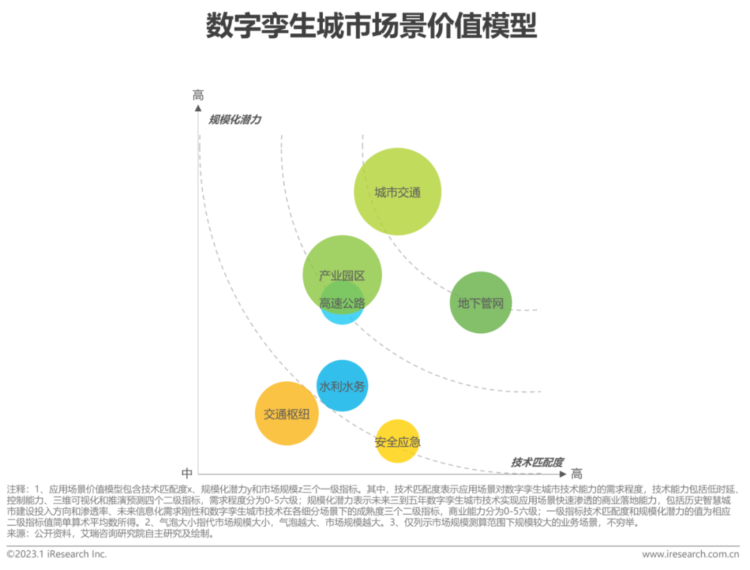 數(shu)字(zi)孿(luan)生(sheng)(sheng)與城(cheng)市業務場(chang)景(jing)(jing)的(de)(de)融合(he)基于許多先(xian)決條件,除在技術體系章節討論過的(de)(de)共(gong)性技術難點外,高密(mi)度(du)的(de)(de)傳感器布設,供算法訓練的(de)(de)大量高質量歷(li)史數(shu)據,充足的(de)(de)資金(jin)預算(現階段數(shu)字(zi)孿(luan)生(sheng)(sheng)還很貴(gui))等都(dou)是數(shu)字(zi)孿(luan)生(sheng)(sheng)城(cheng)市場(chang)景(jing)(jing)價(jia)值(zhi)實(shi)現的(de)(de)掣肘因素。模型基于對(dui)(dui)場(chang)景(jing)(jing)價(jia)值(zhi)的(de)(de)三(san)(san)個(ge)思考,總(zong)結出技術匹配度(du)、規(gui)(gui)模化潛力和(he)市場(chang)規(gui)(gui)模三(san)(san)個(ge)維(wei)度(du)構建數(shu)字(zi)孿(luan)生(sheng)(sheng)城(cheng)市場(chang)景(jing)(jing)化應用綜(zong)合(he)價(jia)值(zhi)。從(cong)分析結果看,數(shu)字(zi)孿(luan)生(sheng)(sheng)在城(cheng)市運營(ying)管(guan)理中的(de)(de)滲透率還很低,城(cheng)市交通、地下管(guan)網和(he)產業園區是前三(san)(san)大價(jia)值(zhi)場(chang)景(jing)(jing),本章將(jiang)針對(dui)(dui)上述(shu)場(chang)景(jing)(jing)重點分析。