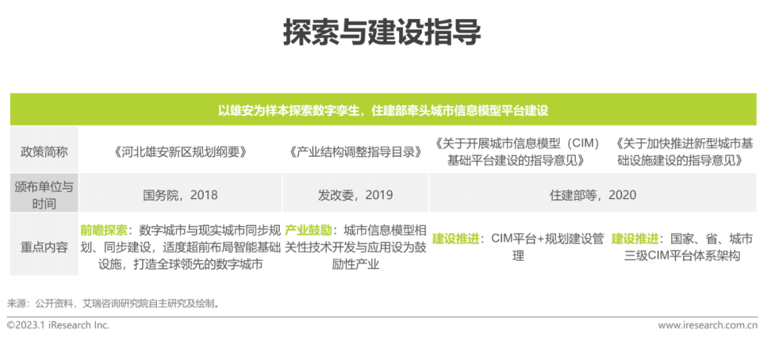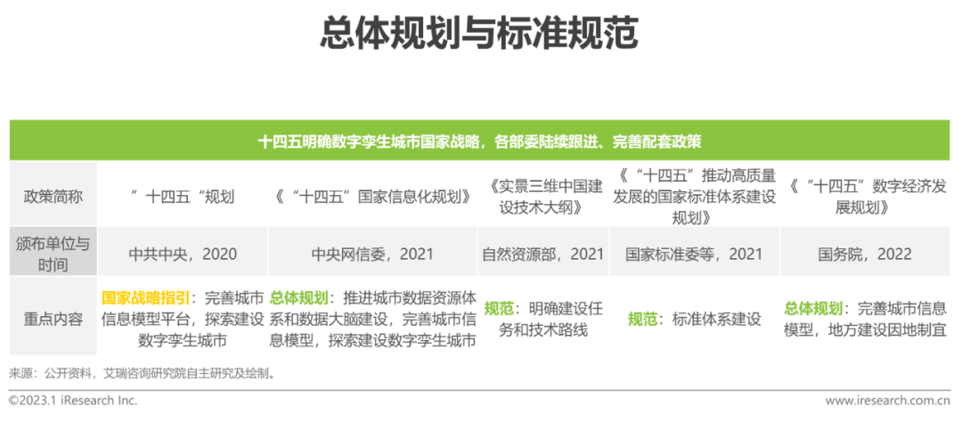 地方層面:《關于(yu)加快推(tui)進新(xin)型城市(shi)(shi)基礎設(she)施建設(she)的指導意見》和“十四五”規(gui)(gui)劃(hua)發布以來,全(quan)國各省級行(xing)政(zheng)區自2021年起陸(lu)續在基礎設(she)施建設(she)三年行(xing)動計(ji)劃(hua)和十四五規(gui)(gui)劃(hua)中(zhong)提(ti)及“數字孿(luan)生城市(shi)(shi)”或概念相(xiang)關建設(she)內容,數字孿(luan)生作為需突破的信息領域關鍵技(ji)術列(lie)入多(duo)地(di)科技(ji)創(chuang)新(xin)規(gui)(gui)劃(hua)。