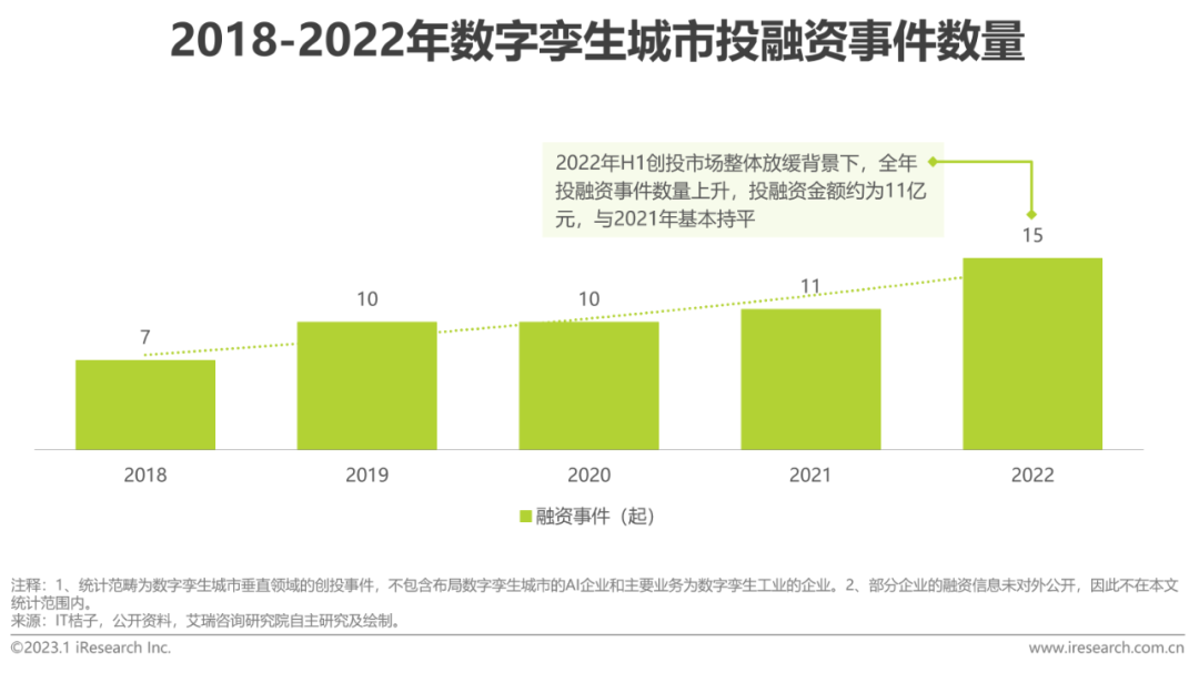 根(gen)據不完全統計,2022年數字孿生(sheng)城市市場融資(zi)(zi)(zi)事件達15起,行業(ye)融資(zi)(zi)(zi)情況呈向好態(tai)勢(shi)并升至高點。資(zi)(zi)(zi)本(ben)市場上(shang),多家專注于數字孿生(sheng)技術城市空(kong)間應用的(de)初創企業(ye)獲得了大額融資(zi)(zi)(zi),明星機構、政府(fu)引導(dao)基金和產業(ye)資(zi)(zi)(zi)本(ben)均有(you)布局(ju)。值得關注的(de)是(shi),廣聯達和騰訊作為產業(ye)資(zi)(zi)(zi)本(ben)動作頻(pin)頻(pin),其中騰訊先后布局(ju)CIM平臺(tai)(tai)、云渲(xuan)染平臺(tai)(tai)、時空(kong)大數據等(deng)多類型廠商,踐行時空(kong)AI戰略;廣聯達基于BIM技術和建(jian)筑領(ling)域的(de)積累(lei)構建(jian)數字孿生(sheng)生(sheng)態(tai),提供CIM平臺(tai)(tai)建(jian)設(she)服務。