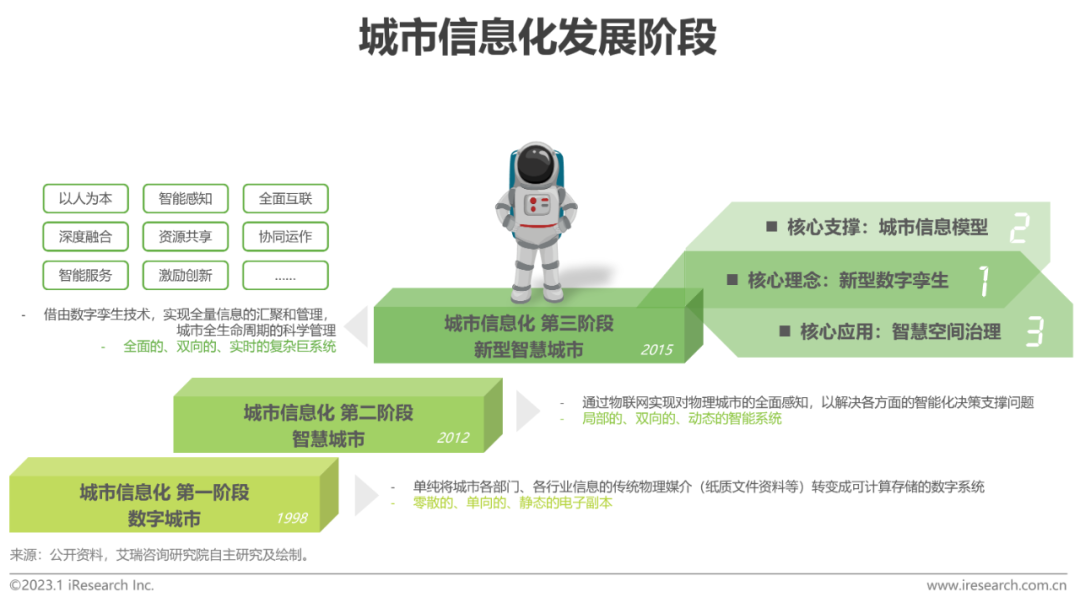 二十(shi)余年(nian)來,我國城市(shi)信息(xi)化(hua)發展(zhan)經(jing)歷(li)了數(shu)字城市(shi)、智慧城市(shi)到新(xin)型智慧城市(shi)三(san)個階段,城市(shi)信息(xi)化(hua)也從(cong)數(shu)字化(hua)向網(wang)絡化(hua)、智能化(hua)發展(zhan)。新型智慧(hui)城市(shi)總(zong)結了前期建(jian)設中存在的問題(數據煙囪等),強調以人為(wei)本,以數字孿生城市(shi)為(wei)核心理念,以城市(shi)信息模型為(wei)新型智慧(hui)城市(shi)建(jian)設的核心支撐,以智慧(hui)空間治理、解決城市(shi)病為(wei)核心應用,賦能新型城鎮化發(fa)展。簡單的說,新型(xing)智慧城市(shi)包(bao)含了(le)數字孿生城市(shi),數字孿生城(cheng)市(shi)是(shi)新(xin)型智(zhi)慧(hui)城(cheng)市(shi)建(jian)設的組(zu)成部分和當前(qian)最優解決方(fang)案,是(shi)數字城(cheng)市(shi)、智(zhi)慧(hui)城(cheng)市(shi)乃至城(cheng)市(shi)信息化的高(gao)級階段(duan),是(shi)未來新型城鎮化建(jian)設的工作(zuo)重(zhong)點。