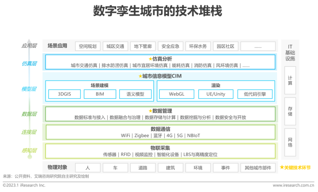 數字孿生城市不是單一技術(shu),而是以積木式組裝結合了(le)物聯網、大數據、BIM、GIS、人(ren)工智能等多項前沿技術的“巨技術”,其技術復雜性和(he)建設難(nan)度不言而喻 ,但與此同時具有(you)一定(ding)的歷史積累和(he)產業基礎。目前(qian)前(qian)端傳(chuan)感器設備(bei)產(chan)業鏈(lian)相(xiang)對完(wan)善,穩定高(gao)速的通(tong)信隨著5G普及(ji)有望實現,在(zai)技術(shu)進步及(ji)利好政策(ce)驅動(dong)下云服務的應用逐漸深入,數字孿生城市亟需解決(jue)的技術(shu)難點主要(yao)聚(ju)焦在數據管理、信息模(mo)型和仿真(zhen)分析三個環節(jie),本章后續頁面將(jiang)針對其中的重點內容展開分析。多技(ji)術融(rong)合,自下而上、由實入(ru)(ru)虛(xu)再入(ru)(ru)實,形成了支撐數字孿生城市技(ji)術理念(nian)的(de)、運行機(ji)制閉環(huan)的(de)技(ji)術堆棧(zhan)。