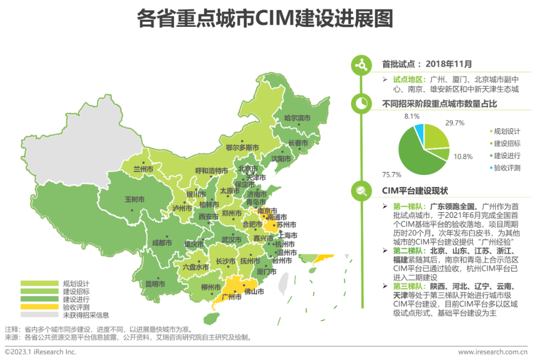 住建部牽頭的(de)城市(shi)信(xin)息模型(xing)平臺建設是數字孿生(sheng)城市(shi)的(de)建設重點,基(ji)于CIM平臺的(de)行業應用(yong)將加速規(gui)模擴張。目前大部分省份(fen)已開(kai)始(shi)試點城市(shi)市(shi)級CIM平臺的(de)一期(qi)建設,廣(guang)東、江(jiang)蘇(su)等經濟發達省份(fen)已建立標桿指導,場景化應用(yong)同步推進。