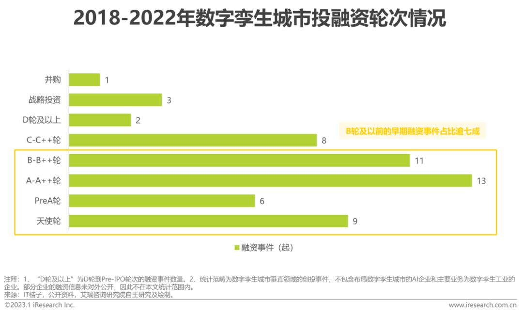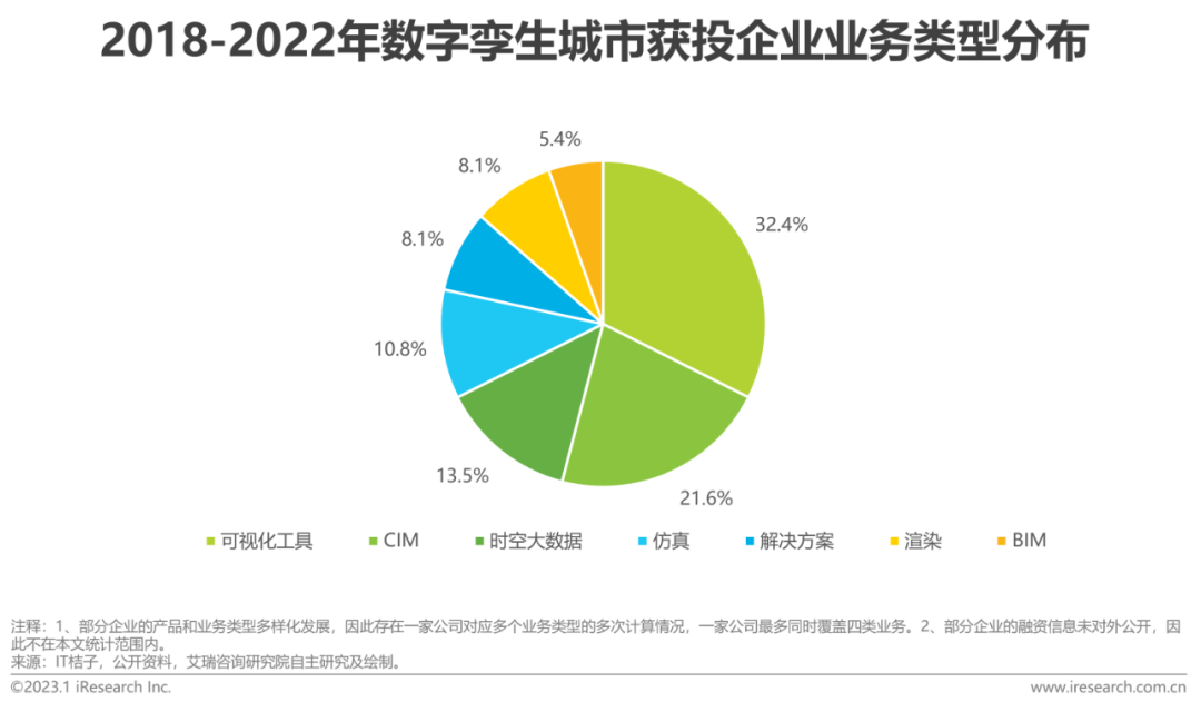 近五年獲投的(de)初創企業(ye)業(ye)務(wu)類型(xing)主要分布在可(ke)(ke)(ke)視化(hua)工具、CIM平(ping)臺(tai)和(he)時空大數(shu)(shu)(shu)據,其中布局(ju)可(ke)(ke)(ke)視化(hua)業(ye)務(wu)的(de)企業(ye)占比(bi)近1/3,兩方面(mian)(mian)因(yin)素(su)形(xing)成(cheng)了這一格局(ju)。一方面(mian)(mian)數(shu)(shu)(shu)字孿生(sheng)城(cheng)市是地理(li)信息(xi)產業(ye)、數(shu)(shu)(shu)字建筑業(ye)和(he)智慧城(cheng)市的(de)融合與(yu)建設延續,上游BIM、GIS行(xing)業(ye)和(he)下游解決方案、集成(cheng)商(shang)市場(chang)均存(cun)在高行(xing)業(ye)和(he)規模壁壘(lei),另一方面(mian)(mian)可(ke)(ke)(ke)視化(hua)作為支撐(cheng)性(xing)(xing)、通用性(xing)(xing)產品(pin)與(yu)技(ji)術是投入產出比(bi)最(zui)大、最(zui)快實現商(shang)業(ye)變現的(de)賽道。過(guo)往融資(zi)輪次集中在早期階段,可(ke)(ke)(ke)見我國(guo)數(shu)(shu)(shu)字孿生(sheng)城(cheng)市初創企業(ye)多(duo)處在成(cheng)長期。