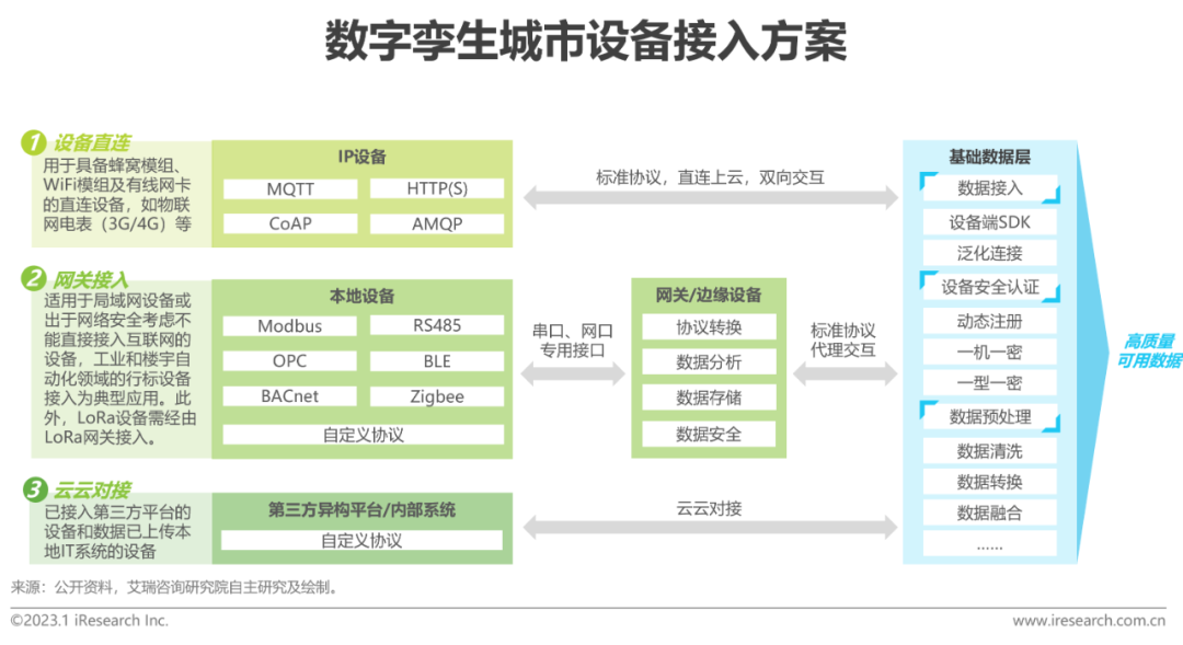 廣泛布設的(de)傳感器設備(bei)和全(quan)面(mian)連(lian)接(jie)(jie)的(de)智能化(hua)設備(bei)是(shi)數(shu)字孿生(sheng)城市建(jian)設的(de)基礎和前提條件,也是(shi)孿生(sheng)城市動態數(shu)據(ju)養分(fen)的(de)來源。設備(bei)的(de)接(jie)(jie)入、通(tong)信(xin)、控制和聯動是(shi)物(wu)(wu)聯網(wang)的(de)基本功,但在孿生(sheng)全(quan)面(mian)感知需求下,百分(fen)之百的(de)存量/新(xin)增設備(bei)與平臺(tai)雙向通(tong)信(xin)使(shi)得建(jian)設難(nan)度大幅提升。面(mian)對多源異構(gou)通(tong)信(xin)協議(yi),廠商物(wu)(wu)聯網(wang)平臺(tai)主要(yao)通(tong)過設備(bei)直連(lian)、網(wang)關接(jie)(jie)入和云(yun)云(yun)對接(jie)(jie)三種(zhong)方(fang)式建(jian)立(li)高并發(fa)、穩定、可靠、安全(quan)的(de)設備(bei)通(tong)信(xin),以(yi)求消除海量終端通(tong)信(xin)協議(yi)的(de)差異、統一標(biao)準,但網關接入設(she)備(bei)(bei)類型受限(xian)、設(she)備(bei)(bei)接口不(bu)標準/被占用(yong)/無法新(xin)增等(deng)難(nan)題(ti)仍存在,依靠平臺側軟件集成(cheng)的(de)方(fang)式解決(jue)問(wen)題(ti)不(bu)可避免(mian)的(de)造(zao)成(cheng)了(le)項目建設(she)進度(du)的(de)延后和成(cheng)本高筑,國(guo)家(jia)/行業層面亟需出臺相關標準,在下一輪設(she)備(bei)(bei)更新(xin)周期中實現(xian)物聯網通信協議的(de)統一。