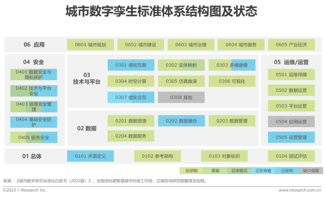 2021年3月,全國信標(biao)(biao)(biao)委智慧(hui)城市(shi)(shi)工作組(zu)(zu)成立了城市(shi)(shi)數(shu)(shu)字孿(luan)(luan)生專題組(zu)(zu),負責(ze)城市(shi)(shi)數(shu)(shu)字孿(luan)(luan)生標(biao)(biao)(biao)準(zhun)(zhun)體(ti)系和關鍵標(biao)(biao)(biao)準(zhun)(zhun)研究,推(tui)動(dong)標(biao)(biao)(biao)準(zhun)(zhun)試(shi)驗驗證與(yu)應用示范工作。目(mu)前已完成國內城市(shi)(shi)數(shu)(shu)字孿(luan)(luan)生標(biao)(biao)(biao)準(zhun)(zhun)第1部分(fen):技術參考架構的預研究工作,進(jin)入(ru)國家標(biao)(biao)(biao)準(zhun)(zhun)申報(bao)流程。城市(shi)(shi)數(shu)(shu)字孿(luan)(luan)生標(biao)(biao)(biao)準(zhun)(zhun)體(ti)系結構圖由“01總體(ti)”“02數(shu)(shu)據”“03技術與(yu)平(ping)臺(tai)”“04安(an)全”“05運(yun)(yun)維/運(yun)(yun)營”“06應用”六部分(fen)標(biao)(biao)(biao)準(zhun)(zhun)分(fen)體(ti)系組(zu)(zu)成,參考單一(yi)標(biao)(biao)(biao)準(zhun)(zhun)狀態,技術與(yu)平(ping)臺(tai)標(biao)(biao)(biao)準(zhun)(zhun)和安(an)全標(biao)(biao)(biao)準(zhun)(zhun)進(jin)度相對靠前,應用標(biao)(biao)(biao)準(zhun)(zhun)進(jin)度相對滯后。
