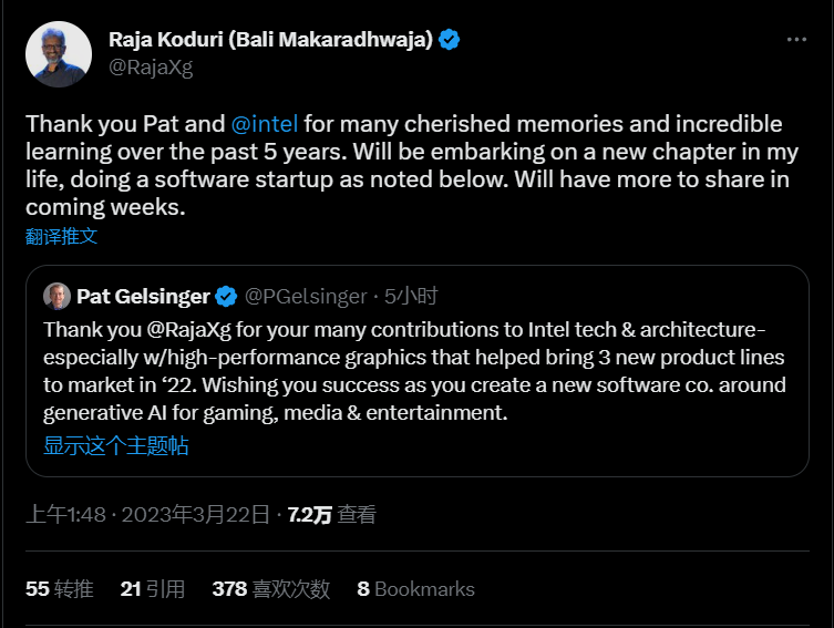 Koduri 回應說,感謝與 Gelsinger 在英特爾度過的時光,并表示他將在未來幾周內公布更多關于這家初創公司的信息。